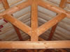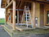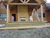 The back "screen porch" deck is structurally complete. The second log columns supporting that roof are installed and the decking is 1/2 done. The insulator was still working Tuesday night but that is now complete. Framing is nearly complete in the basement, with just the bathroom dividing wall to finish. The electrician has started in the basement. The painters have started sealing the west walls and all the upper sections (soffit, facia, siding over the entry) are done. The soffit and trim around all the dormers is complete and the soffit for the front entrance is coming along nicely.